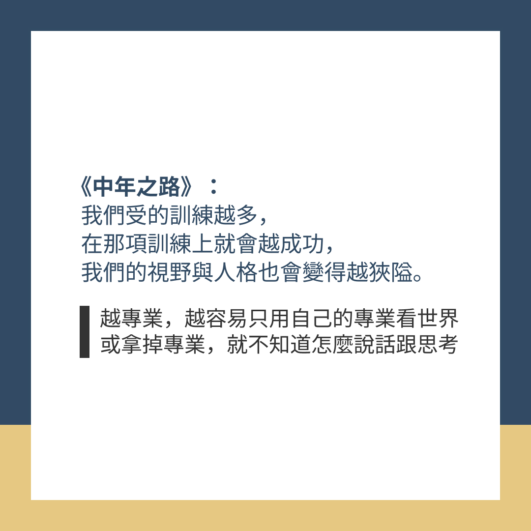 《中年之路》:「我們受的訓練越多,在那項訓練上就會越成功,我們的視野與人格也會變得越狹隘。」