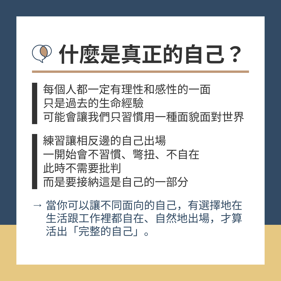 → 當你可以讓不同面向的自己,有選擇地在生活跟工作裡都自在、自然地出場,才算活出「完整的自己」。