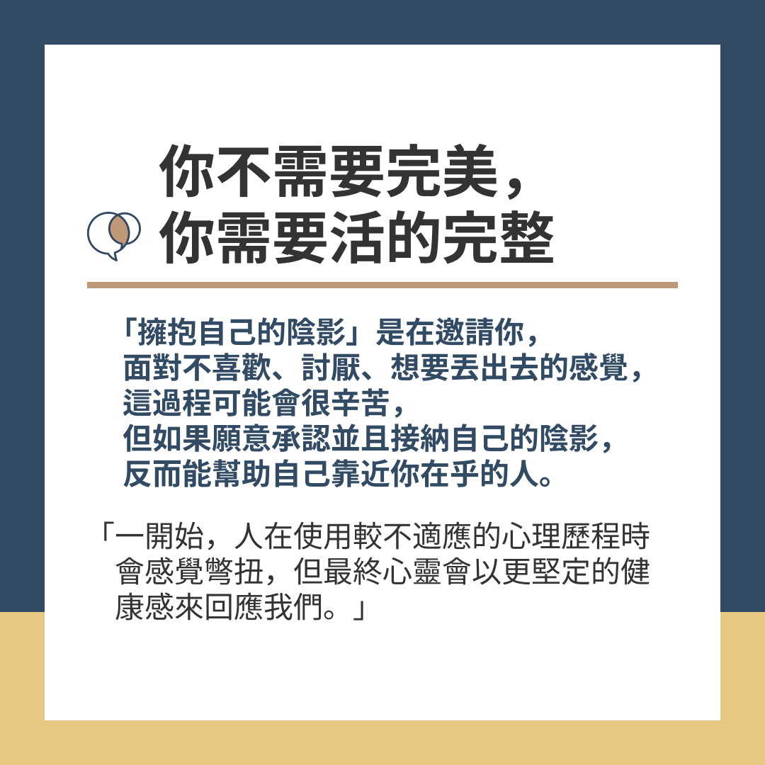 「擁抱自己的陰影」是在邀請你,面對你不喜歡、討厭、想要丟出去的感覺,這過程可能會很辛苦,但如果願意承認並且接納自己的陰影,反而能幫助自己靠近你在乎的人。