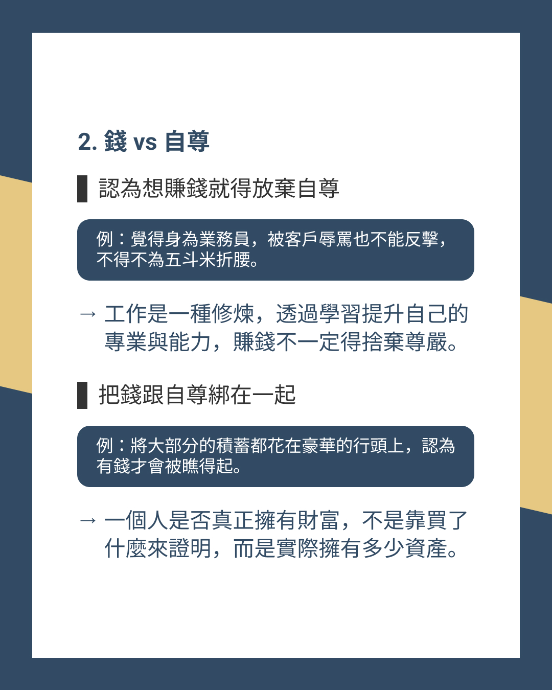 例:Yellow認為,如果老婆堅持要他借三百萬給娘家,否則就離婚,代表她將這段關係的價值視為三百萬。當情感被拿來與金錢衡量時,會讓他走不下去。