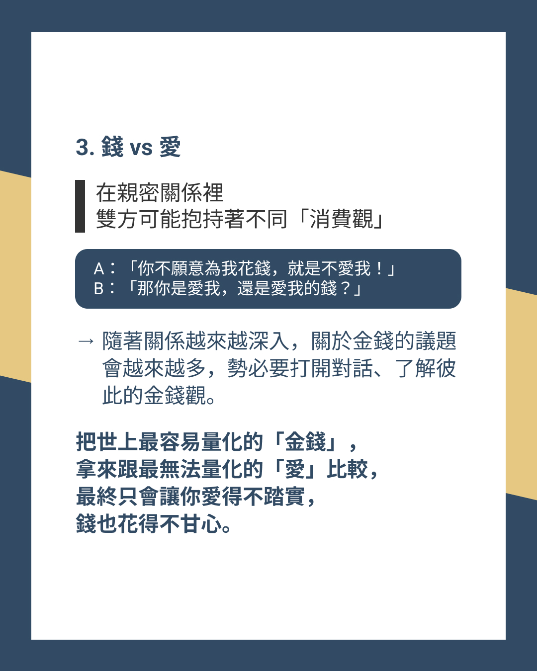 → 隨著關係越來越深入,關於金錢的議題會越來越多,勢必要打開對話、了解彼此的金錢觀。