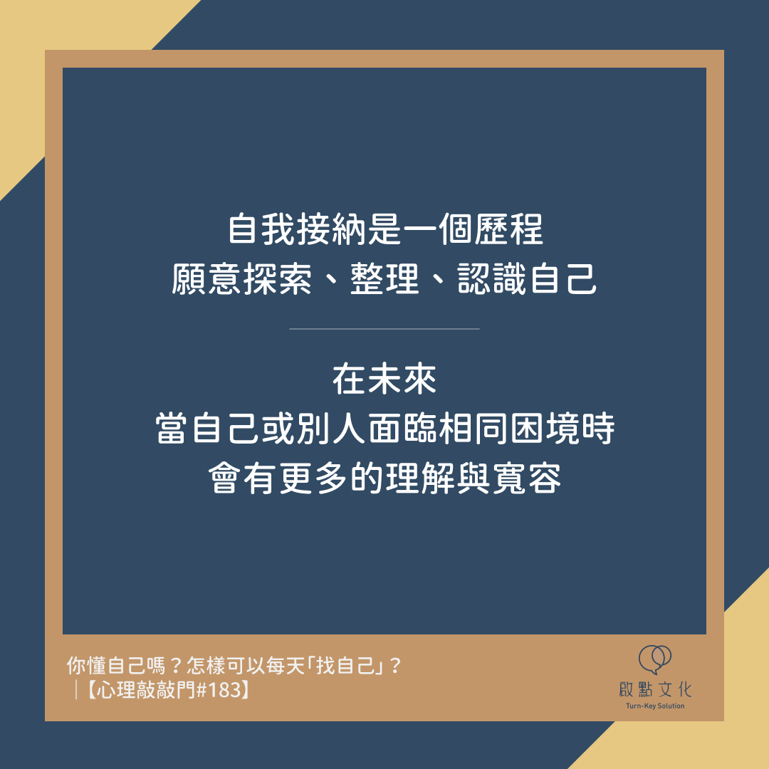 → 自我接納是一個歷程,願意探索、整理、認識自己。在未來,當自己或別人面臨相同困境時,會有更多的理解與寬容。