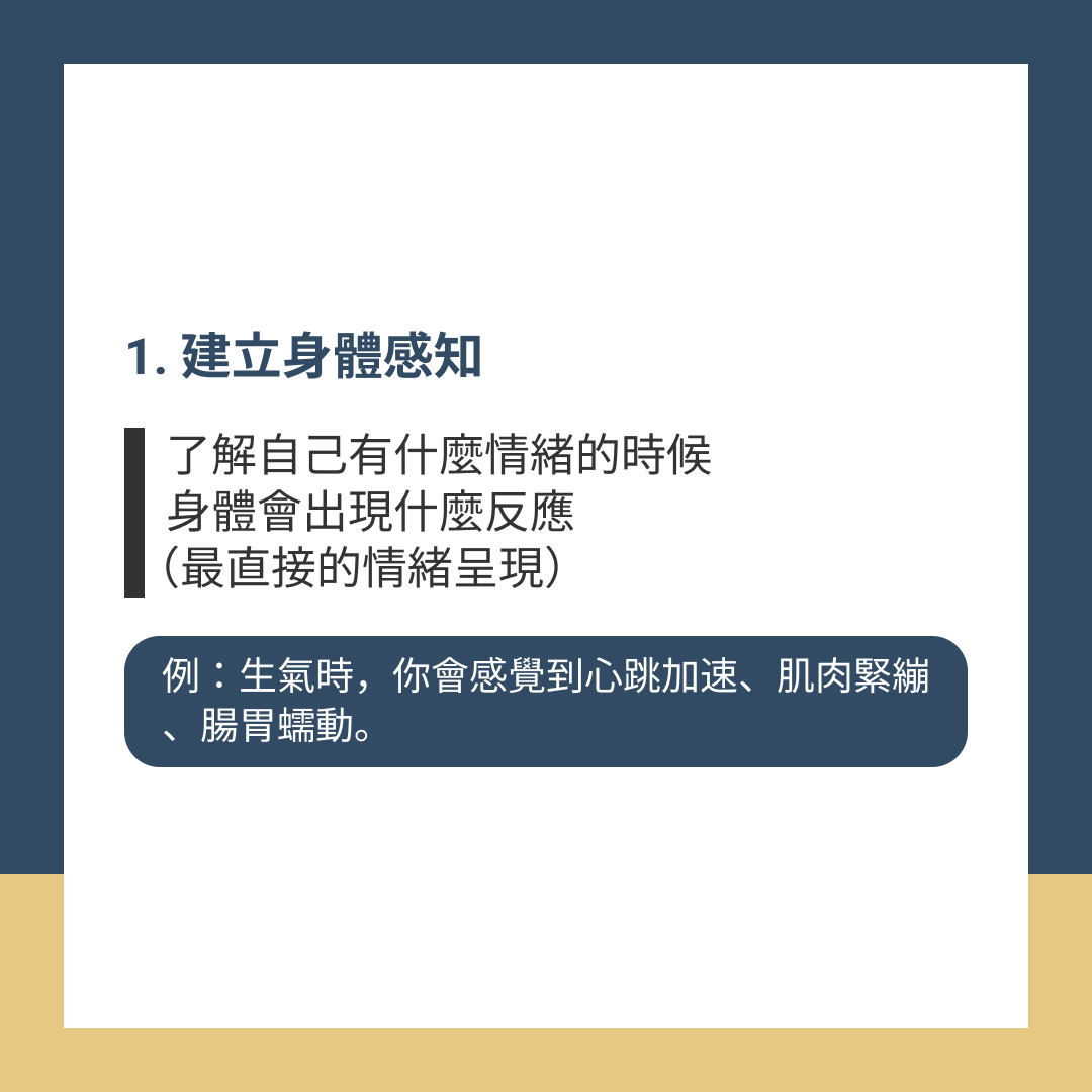 感知到身體訊號後,問自己:「我現在的感覺是什麼?」,建立身體反應與感受的連結,幫助自己更快掌握狀況