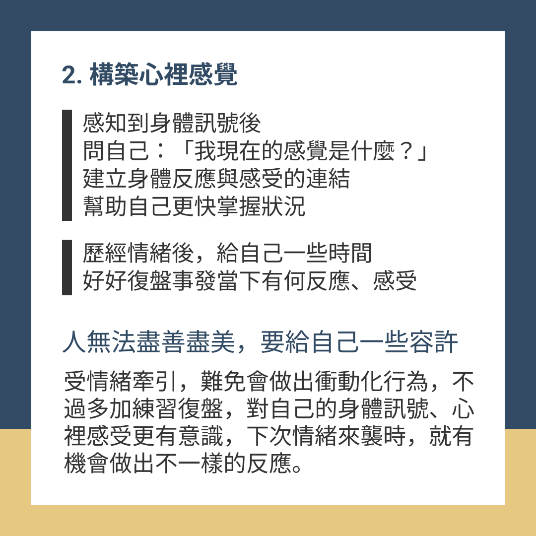 有時受情緒牽引,難免會做出衝動化行為,不過多加練習復盤,對自己的身體訊號、心裡感受更有意識,下次情緒來襲時,就有機會做出不一樣的反應。
