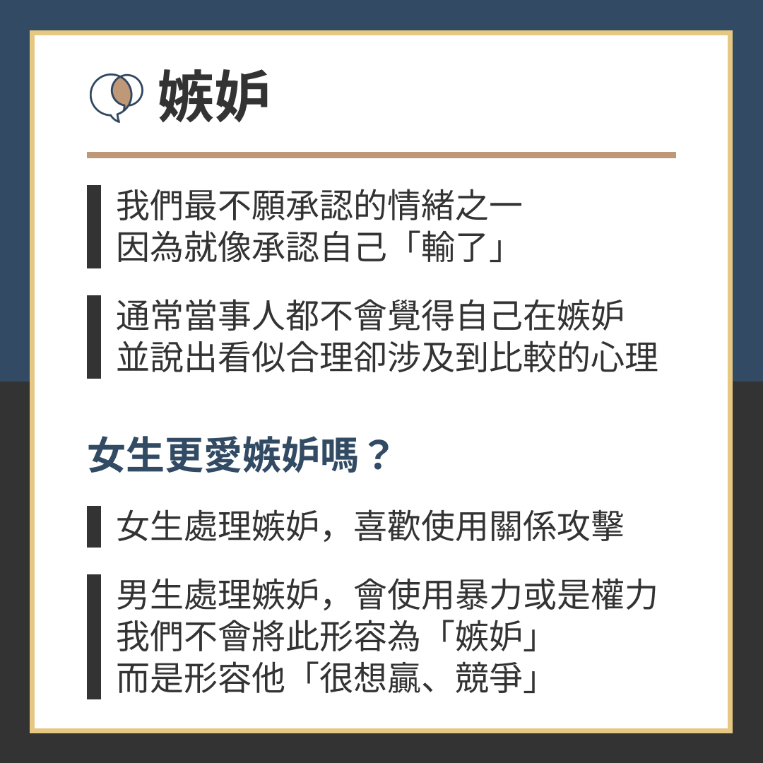 通常當事人都不會覺得自己在嫉妒,並說出看似合理卻涉及到比較的心理