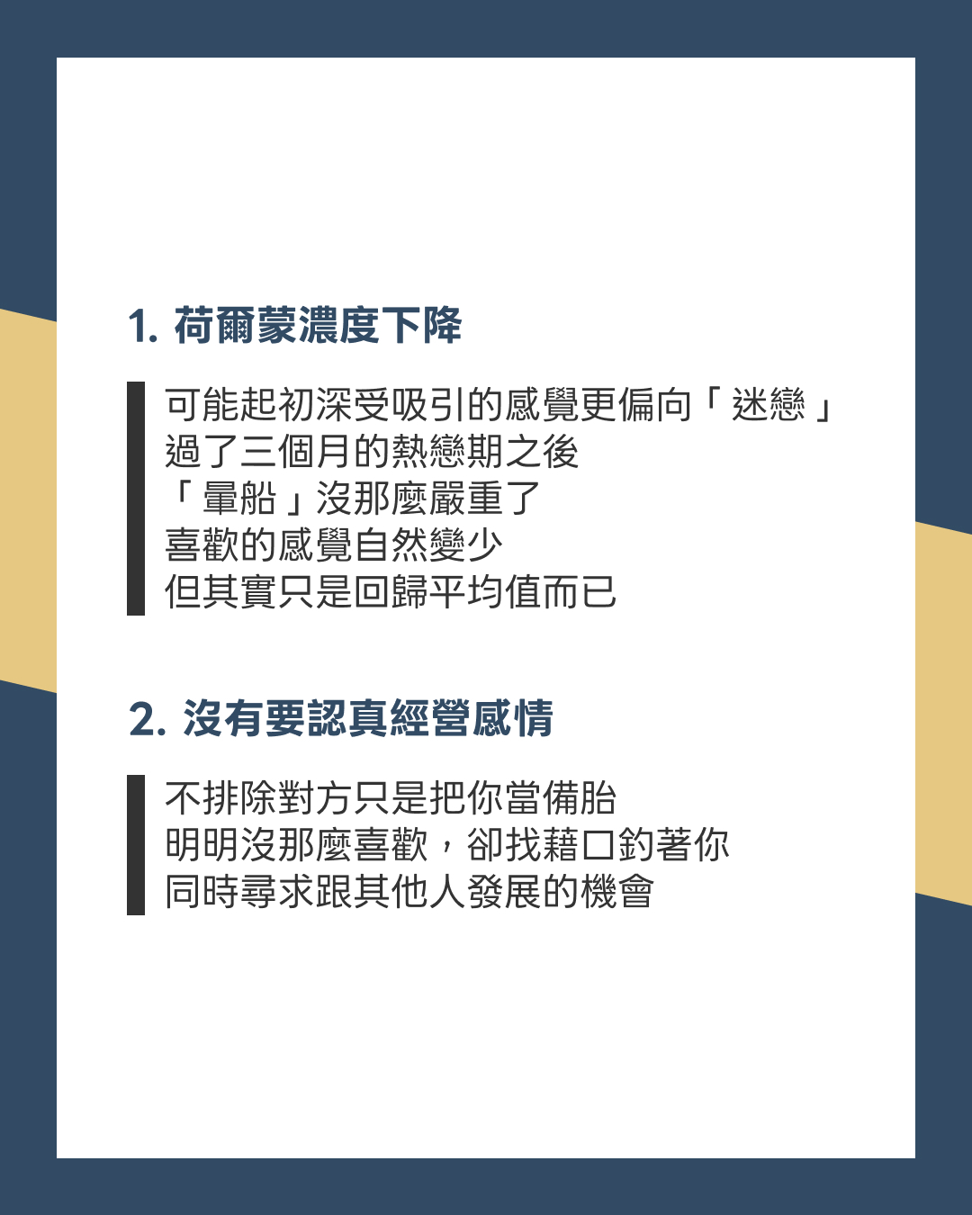 可能起初深受吸引的感覺更偏向「迷戀」,過了三個月的熱戀期後,「暈船」沒那麼嚴重了,喜歡的感覺自然變少(其實只是回歸平均值而已)