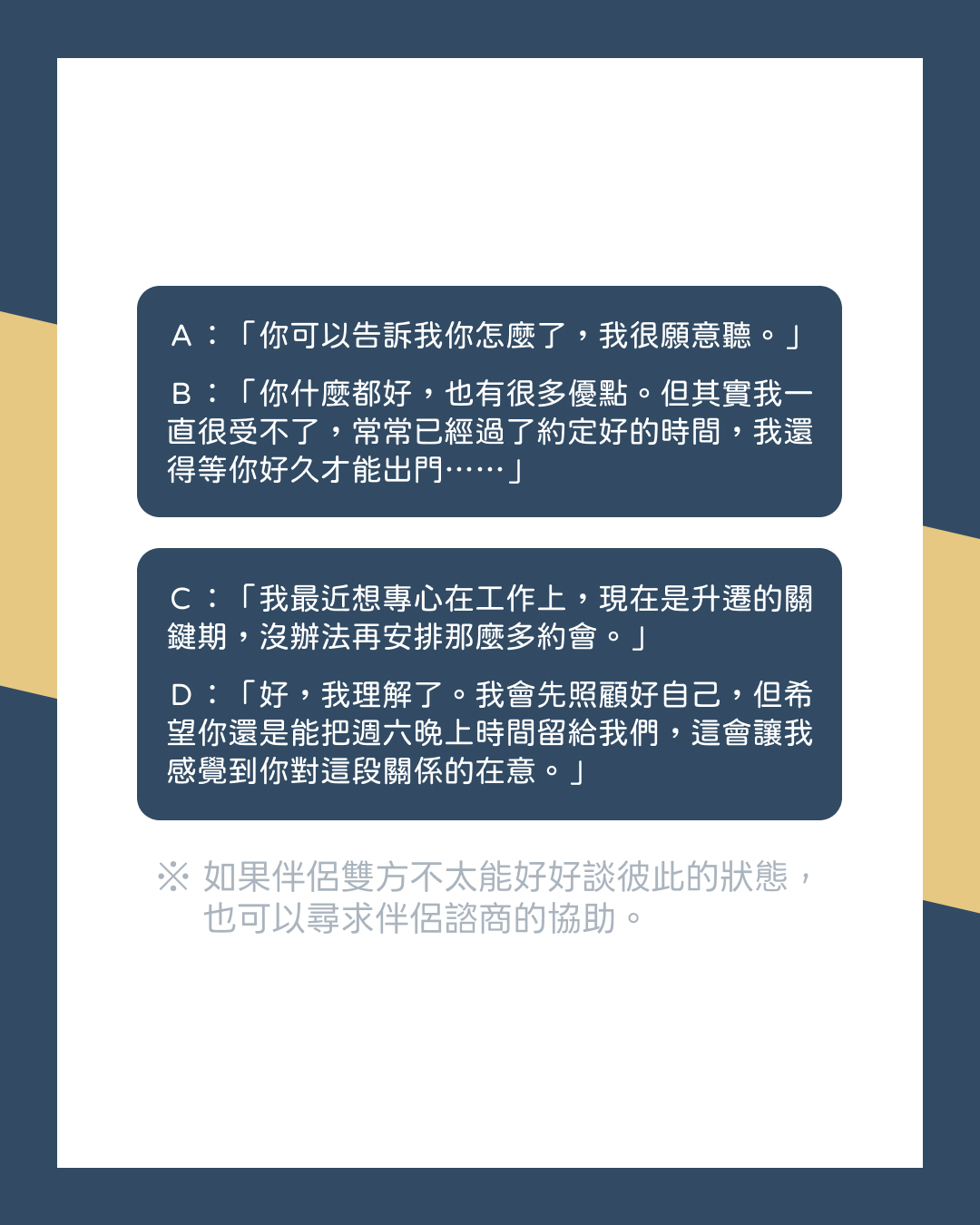 ※ 如果伴侶雙方不太能好好談彼此的狀態,也可以尋求伴侶諮商的協助。