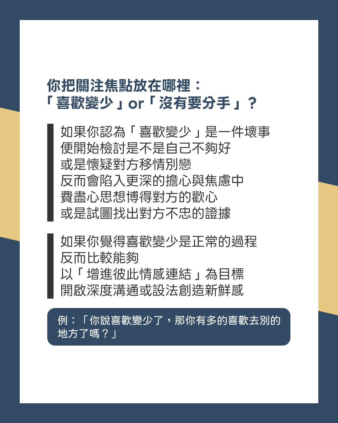 你把關注焦點放在哪裡:「喜歡變少」還是「沒有要分手」?