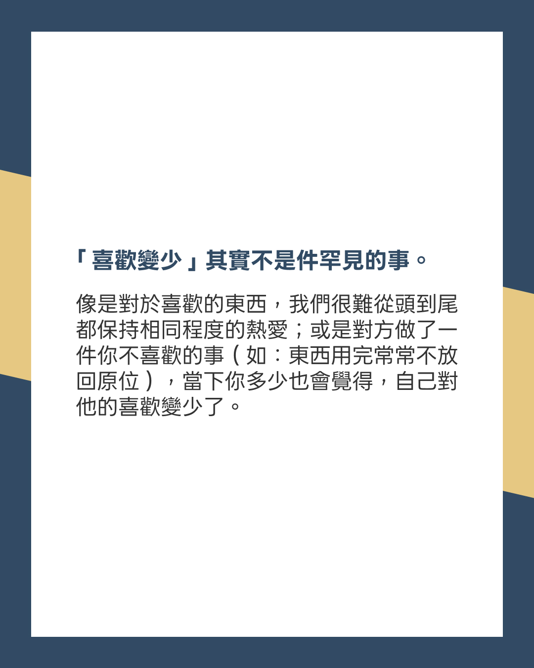 → 「喜歡變少」其實不是一件罕見的事情。像是對於喜歡的東西,我們很難從頭到尾都保持相同程度的熱愛;或是對方做了一件你不喜歡的事(如:東西用完常常不放回原位),當下你多少也會覺得,自己對他的喜歡變少了。