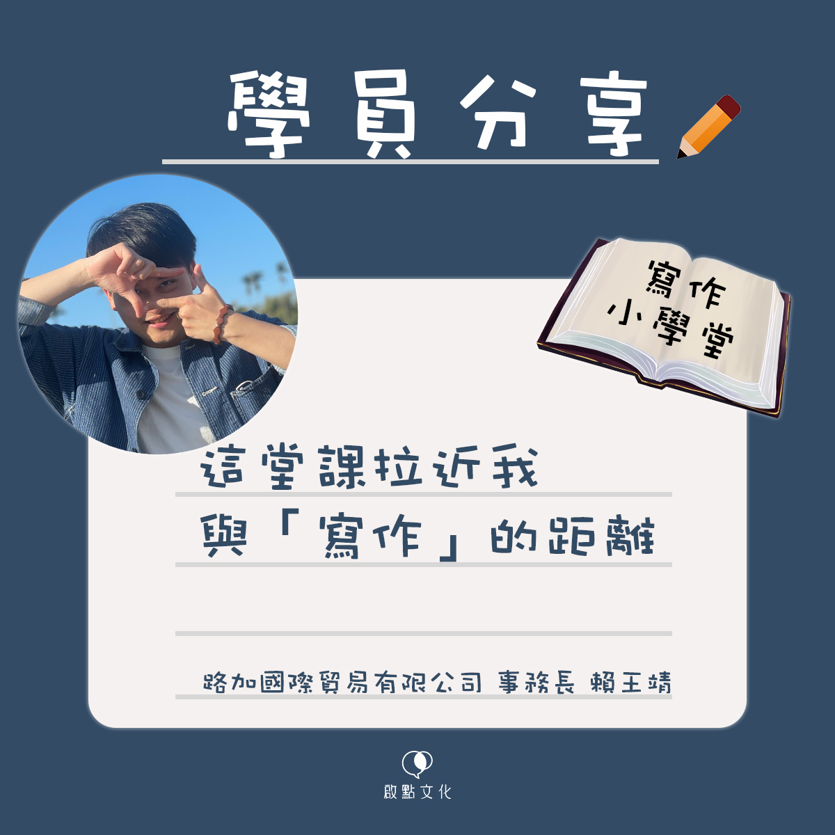 《寫作小學堂─學員分享》這堂課,拉近我與「寫作」的距離~路加國際貿易有限公司 事務長 賴王靖
