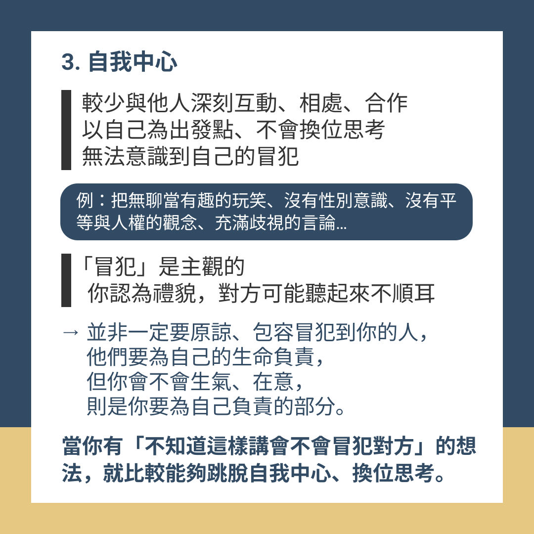 當你有「不知道這樣講,會不會冒犯對方」的想法,就比較能夠跳脫自我中心、嘗試換位思考