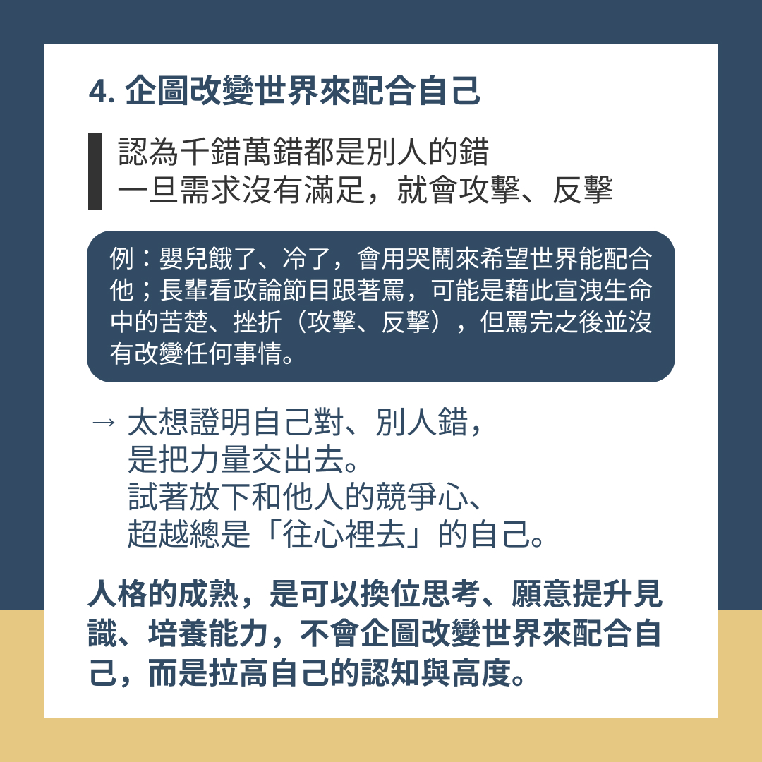 人格的成熟,是可以換位思考、願意提升見識、培養能力,不會企圖改變世界來配合自己,而是拉高自己的認知與高度。