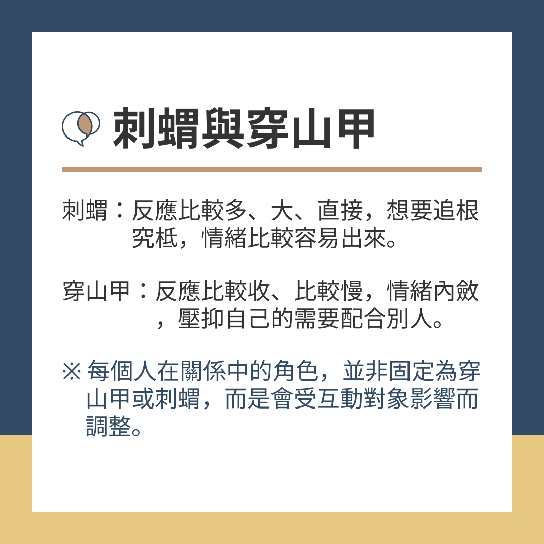 ※ 每個人在關係中的角色,並非固定為穿山甲或刺蝟,而是會受互動對象影響而調整。