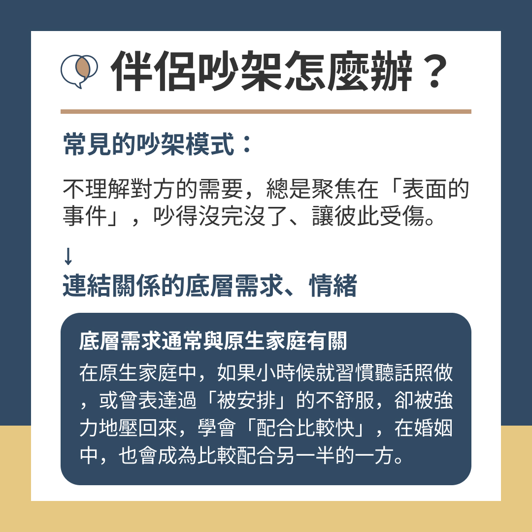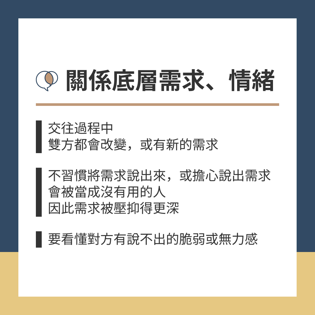 - 不理解對方的需要,總是聚焦在「表面的事件」,吵得沒完沒了、讓彼此受傷