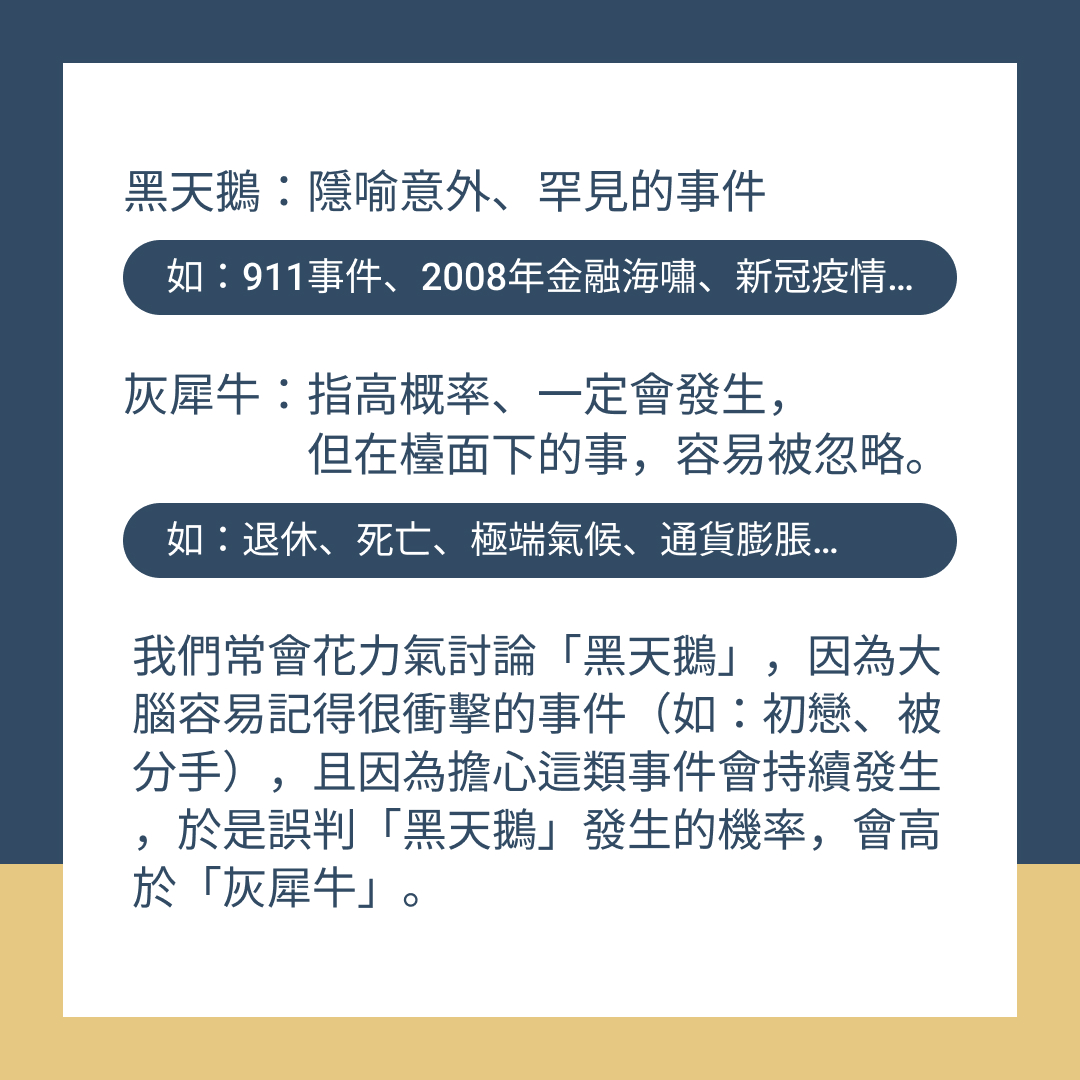 我們常花力氣討論「黑天鵝」,因為大腦容易記得很衝擊的事件(如:初戀、被分手),擔心這類事件會持續發生,於是誤判「黑天鵝」發生的機率會高於「灰犀牛」