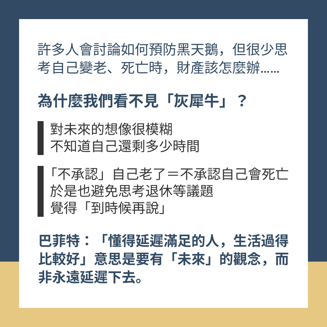 例:許多投資人,會討論如何預防黑天鵝,但很少思考自己變老、死亡時,財產該怎麼辦。