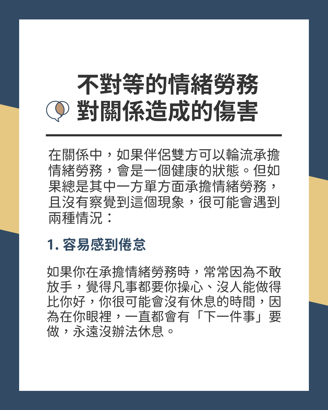→ 體貼是真實的,困擾也是真實的。但體貼的一方,往往會習慣壓抑自己的需求,承擔比較多「情緒勞務」。