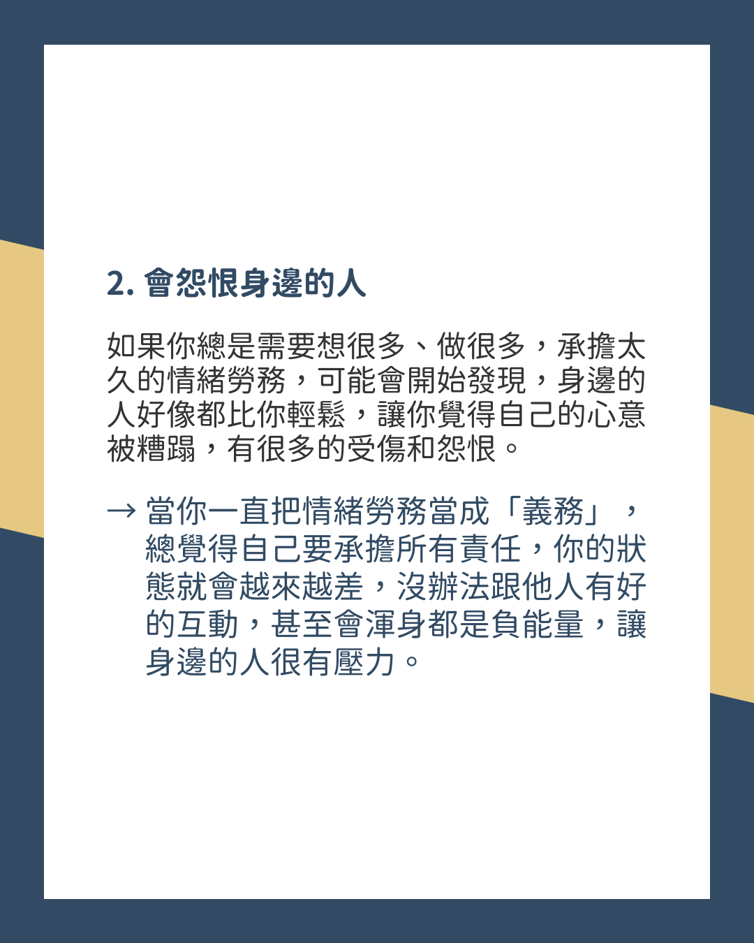 → 當你一直把情緒勞務當成「義務」,總覺得自己要承擔所有責任,你的狀態就會越來越差,沒辦法跟他人有好的互動,甚至會渾身都是負能量,讓身邊的人很有壓力。
