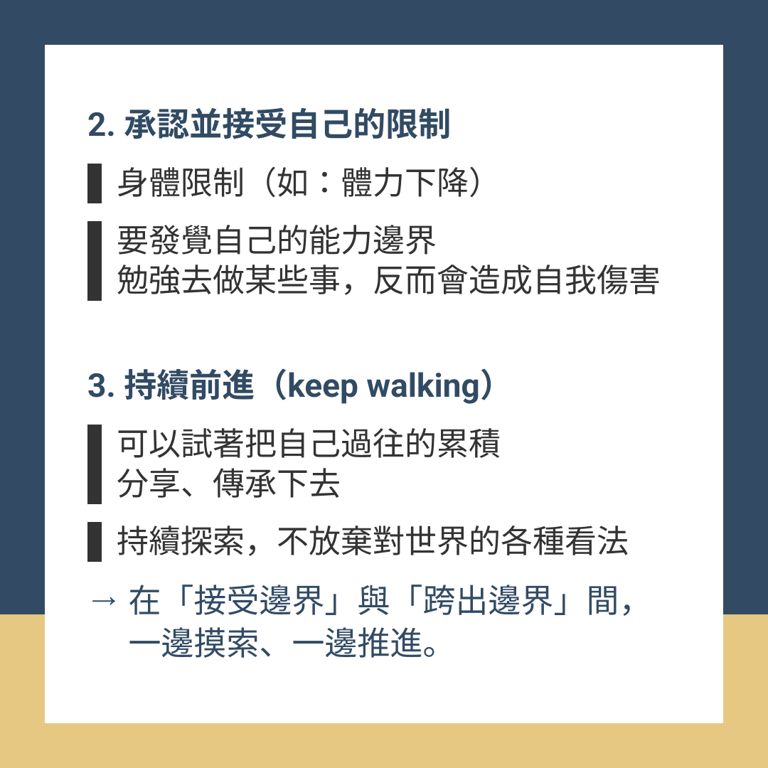 → 在「接受邊界」與「跨出邊界」間,一邊摸索、一邊推進。