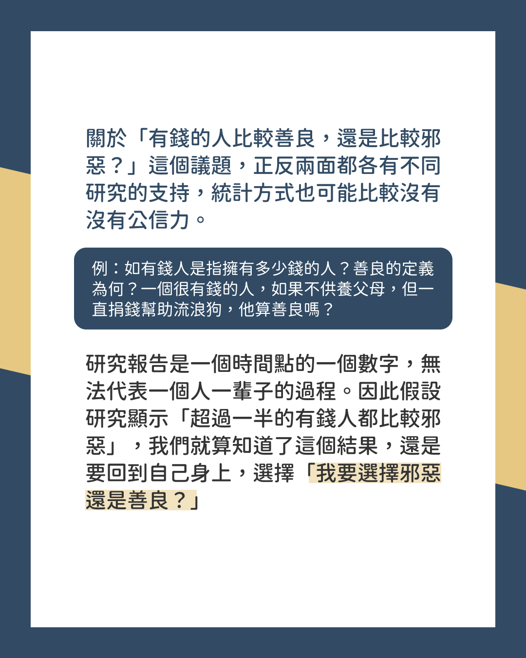 假設研究顯示,超過一半的有錢人都比較邪惡,我們就算知道了這個結果,還是要回到自己身上,選擇「我要選擇善良還是邪惡?」