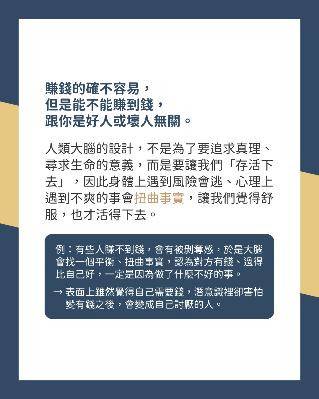 所以有些人賺不到錢,會有被剝奪感,於是大腦會找一個平衡、扭曲事實,認為對方過得比自己好,一定是因為做了什麼不好的事。