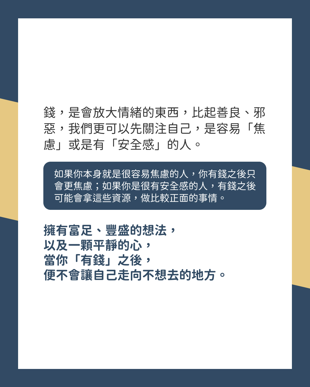 例:如果你本身就是很容易焦慮的人,你有錢之後只會更焦慮;如果你是很有安全感的人,有錢之後可能會拿這些資源,做比較正面的事情。