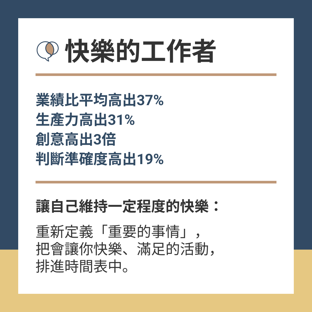 研究發現,快樂的工作者,業績比平均高出37%、生產力高出31%、創意高出3倍、判斷準確度高出19%。