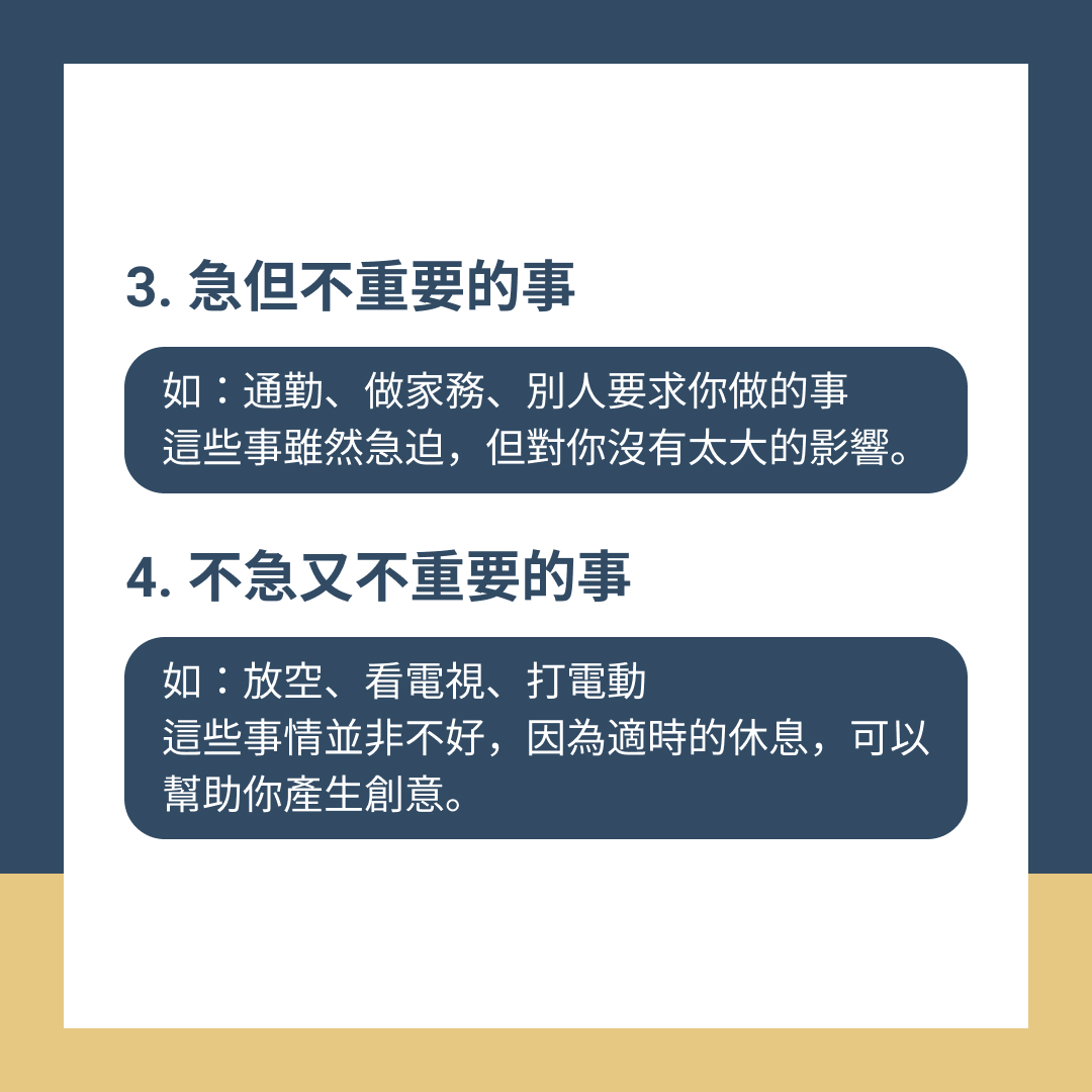 如:通勤、做家務,或別人要求你做的事,這些事情雖然急迫,但對你沒有太大的影響。