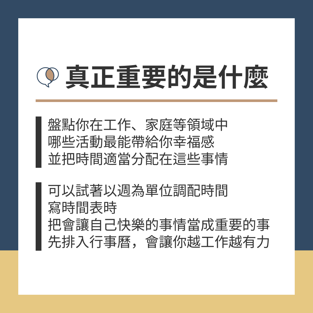 可以試著以週為單位調配時間,寫時間表時,把會讓自己快樂的事情當成重要的事,先排入行事曆,這會讓你越工作越有力。