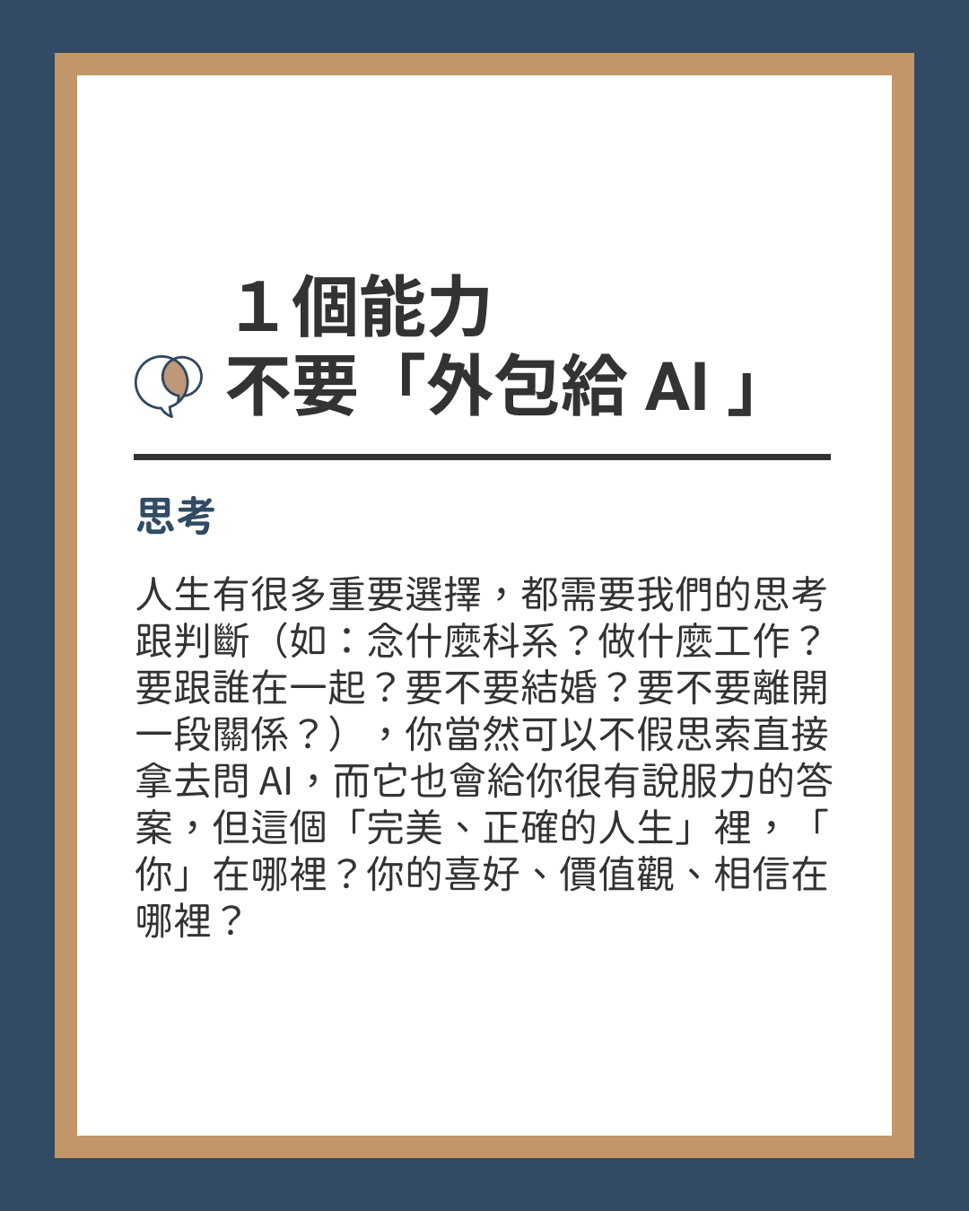 人生有很多重要的選擇,都需要我們的思考跟判斷(如:念什麼科系?做什麼工作?要跟誰在一起?要不要結婚?要不要離開一段關係?),你當然可以不假思索直接拿去問 AI,而它也會給你很有說服力的答案,但這個「完美、正確的人生」裡,「你」在哪裡?你的喜好、價值觀、相信在哪裡?