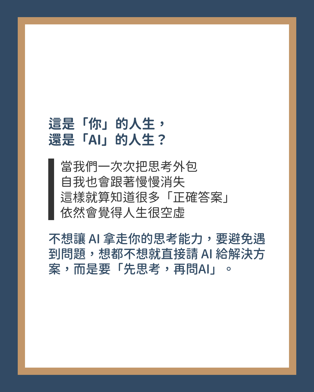 → 如果不想讓 AI 拿走你的思考能力,要避免遇到問題,想都不想就直接請 AI 給解決方案,而是要「先思考,再問AI」。