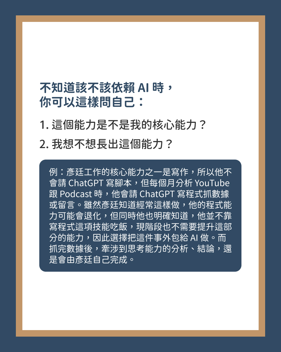 例:彥廷工作的核心能力之一是寫作,所以他不可能請 ChatGPT 寫腳本,但每個月分析 YouTube 跟 Podcast 時,他會請 ChatGPT 寫程式抓數據或留言。雖然彥廷知道經常這樣做,他的程式能力可能會退化,但同時他也明確知道,他並不靠寫程式這項技能吃飯,現階段也不需要提升這部分的能力,因此選擇把這件事外包出去。而抓完數據後,牽涉到思考能力的分析、下結論,還是會由彥廷自己完成。