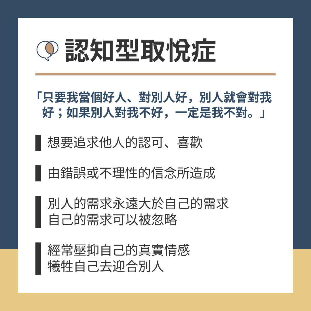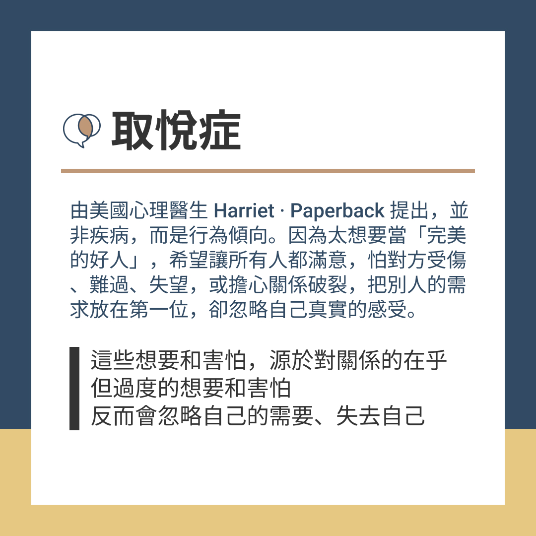 取悅症:由美國心理醫生哈麗雅特‧布萊克提出,並非疾病,而是一種行為傾向。有類人痛苦的來源,不是別人的傷害,而是太想當一個「完美的好人」,希望讓所有人滿意、經常把別人的需求放在第一位,卻忽略自己真實的感受。