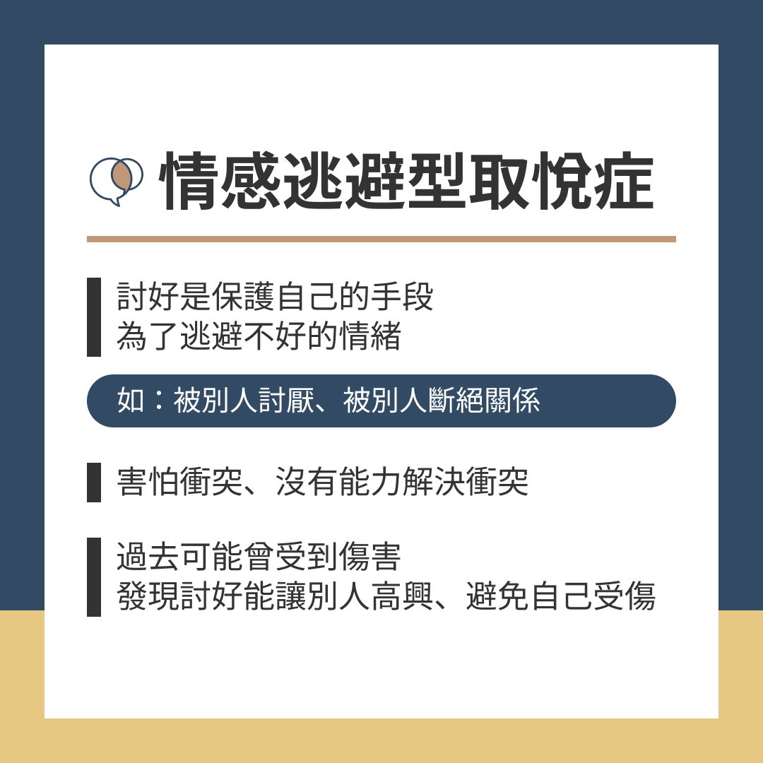 討好是保護自己的手段,為了逃避不好的情緒(如:被別人討厭、被別人斷絕關係)