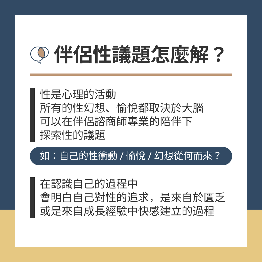 性是心理的活動,所有的性幻想、愉悅都取決於大腦。鼓勵阿寶在伴侶諮商師專業的陪伴下,探索性的議題(如:自己的性衝動/性愉悅/性幻想從何而來?)