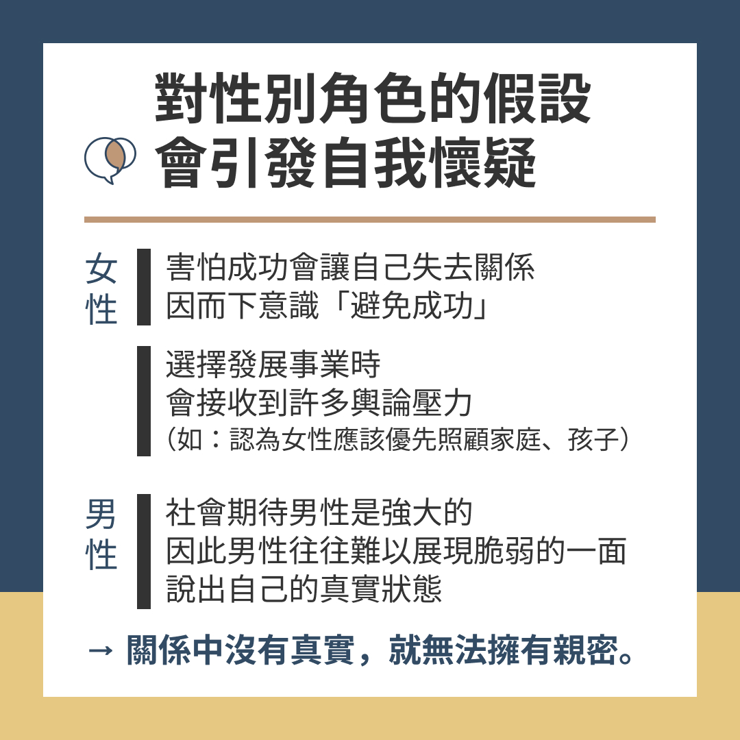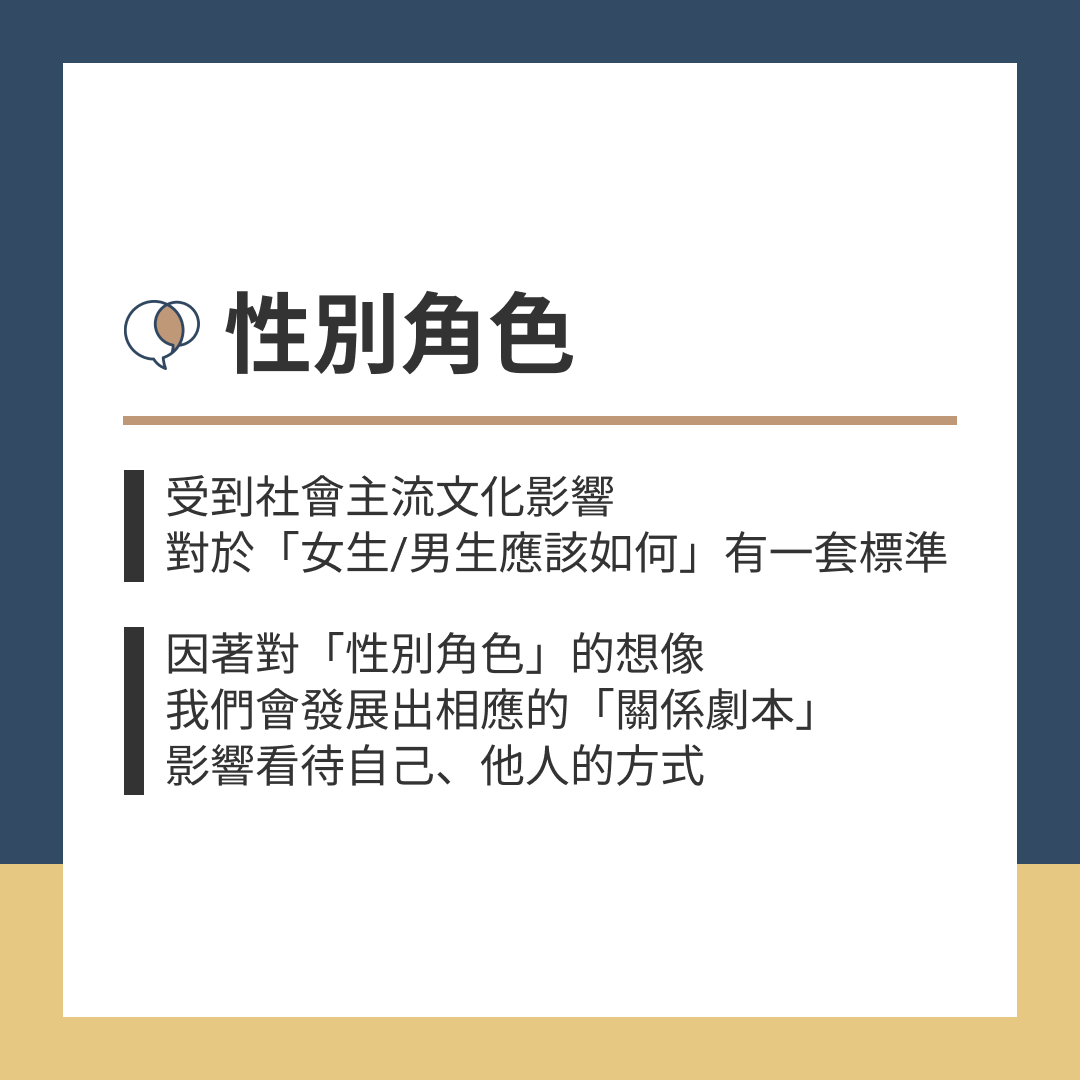 因著對「性別角色」的想像,我們會發展出相應的「關係劇本」,影響看待自己、他人的方式