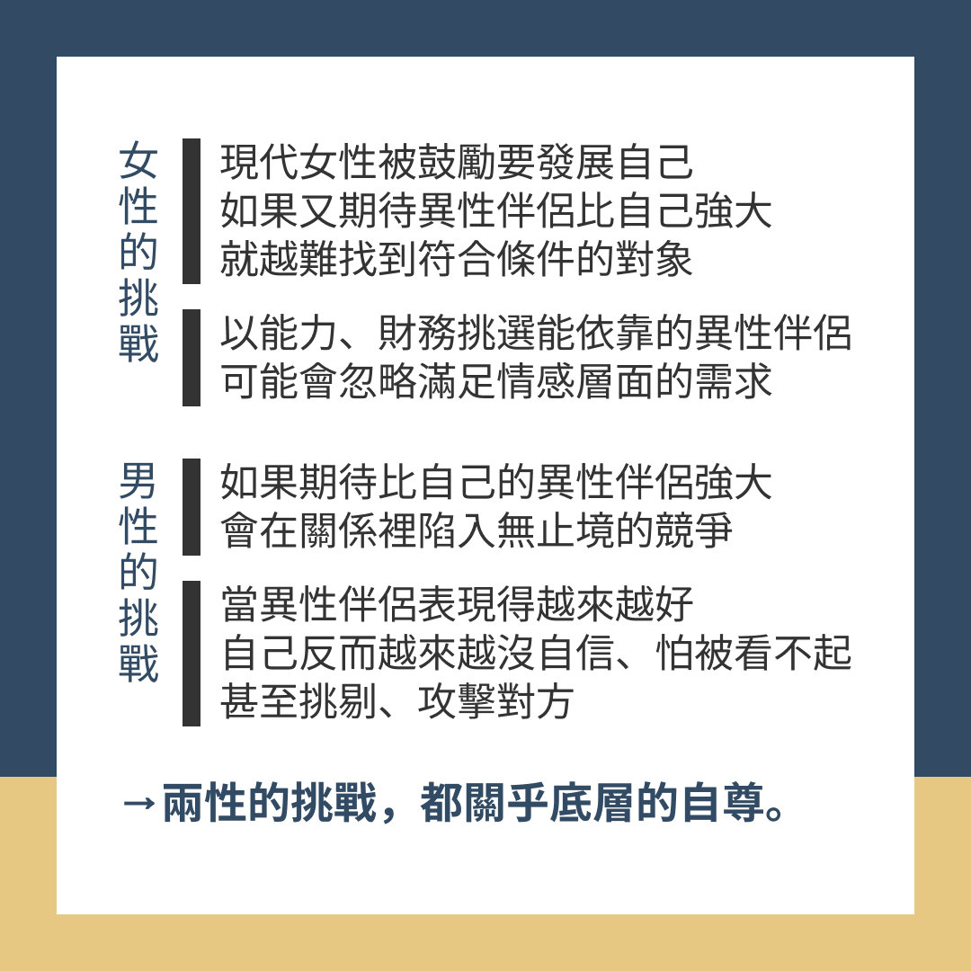 → 女性/男性的挑戰無關乎性別,而是底層的「自尊」。
