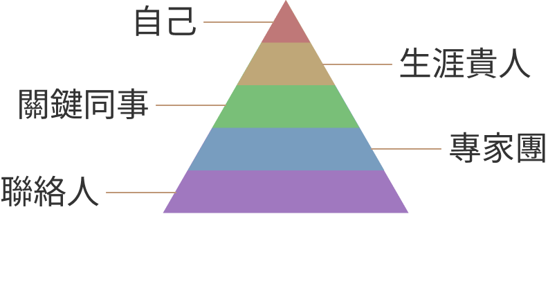 (金字塔從下到上分成五層:聯絡人、專家團、關鍵同事、生涯貴人、你自己)