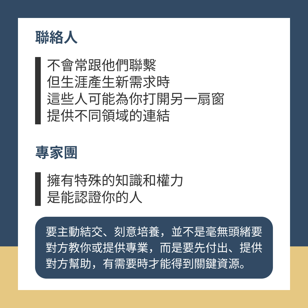 不會常跟他們聯繫,但生涯產生新需求時,這些人可能為你打開另一扇窗、提供不同領域的連結