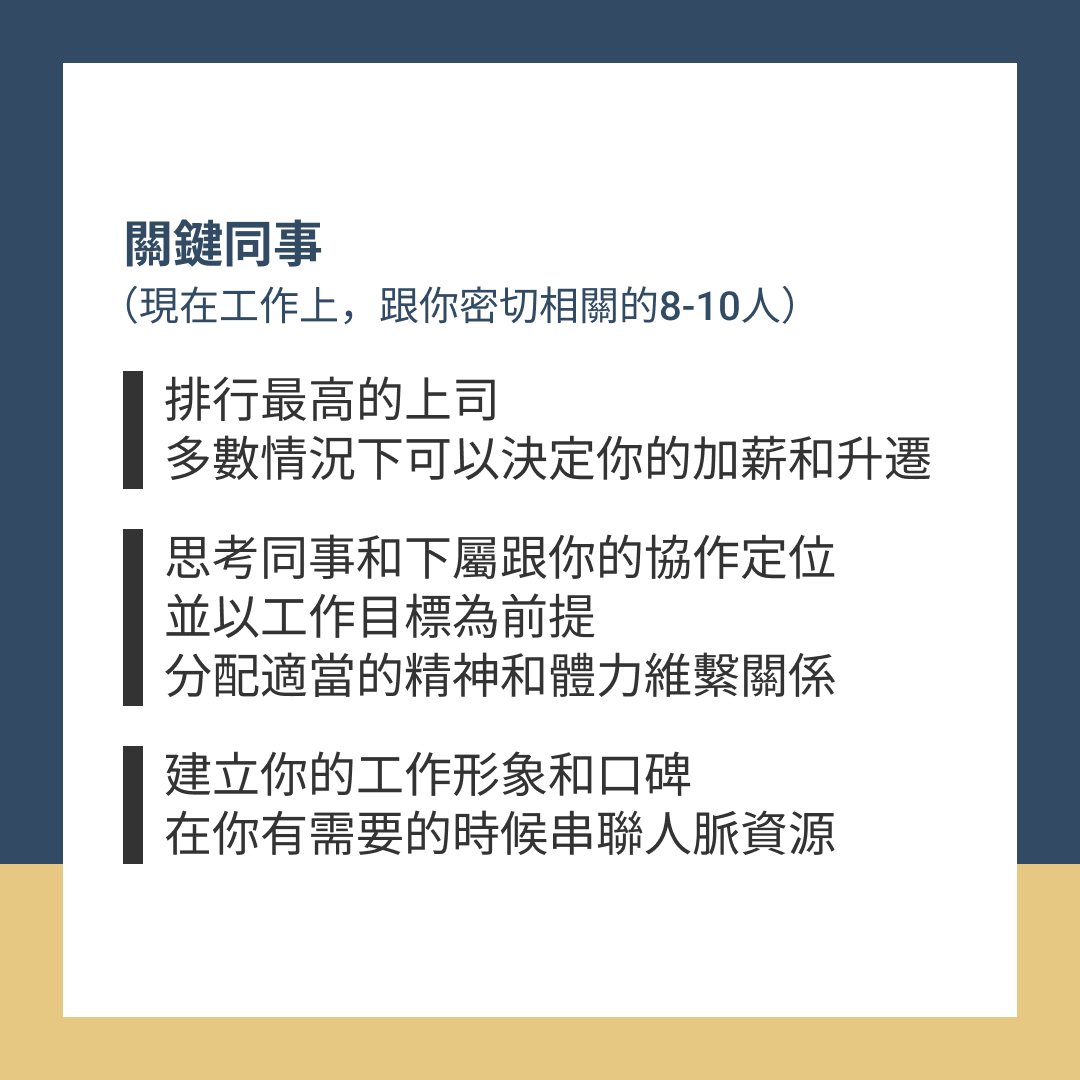 認真思考同事和下屬跟你的協作定位,並以工作目標為前提,分配適當的精神和體力維繫關係,才能建立你的工作形象和口碑,在你有需要的時候為你串聯人脈資源