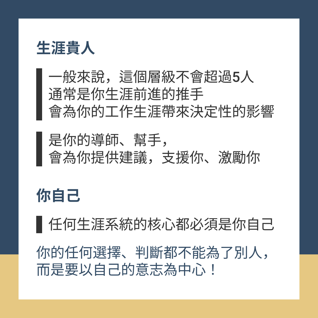 一般來說,這個層級的人數不會超過5人,通常是你生涯前進的推手,甚至會促成你生涯的關鍵轉折