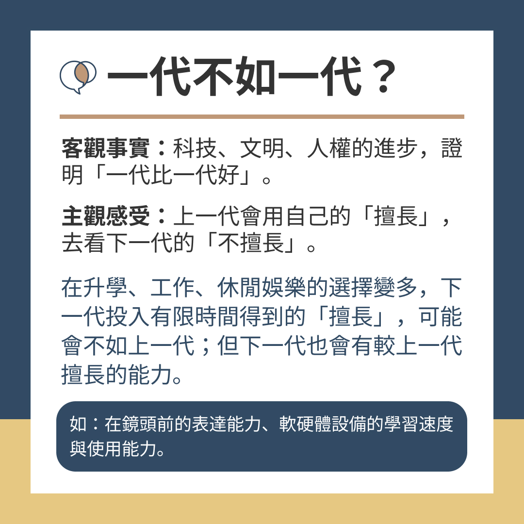 → 下一代在升學、工作、休閒娛樂的選擇變多,投入有限時間所得到的某種能力,可能會不如上一代,但下一代也會有較上一代擅長的能力,如:在鏡頭前的表達能力、軟硬體設備的學習速度與使用能力。