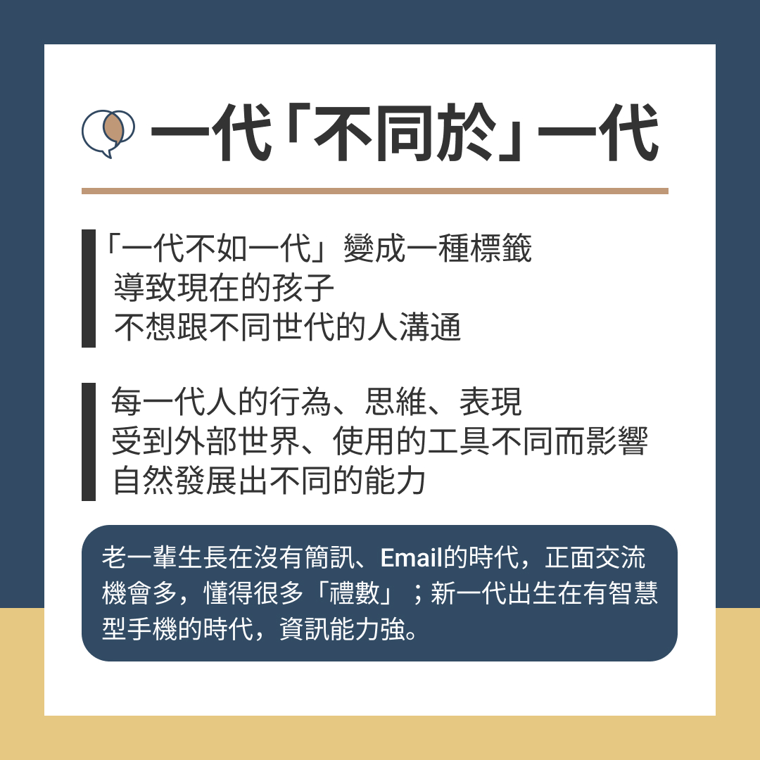 - 「一代不如一代」變成一種標籤,導致現在的孩子,不想跟不同世代的人溝通
