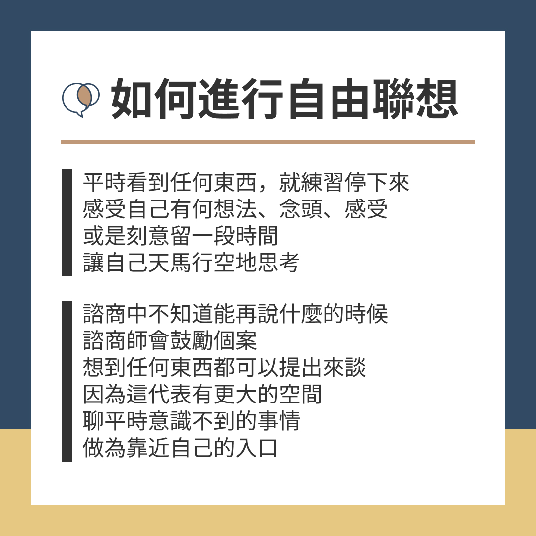 諮商中不知能再說什麼的時候,諮商師會鼓勵個案,想到任何東西都可以提出來談,因為這代表有更大的空間,聊平時意識不到的事情,做為靠近自己的入口
