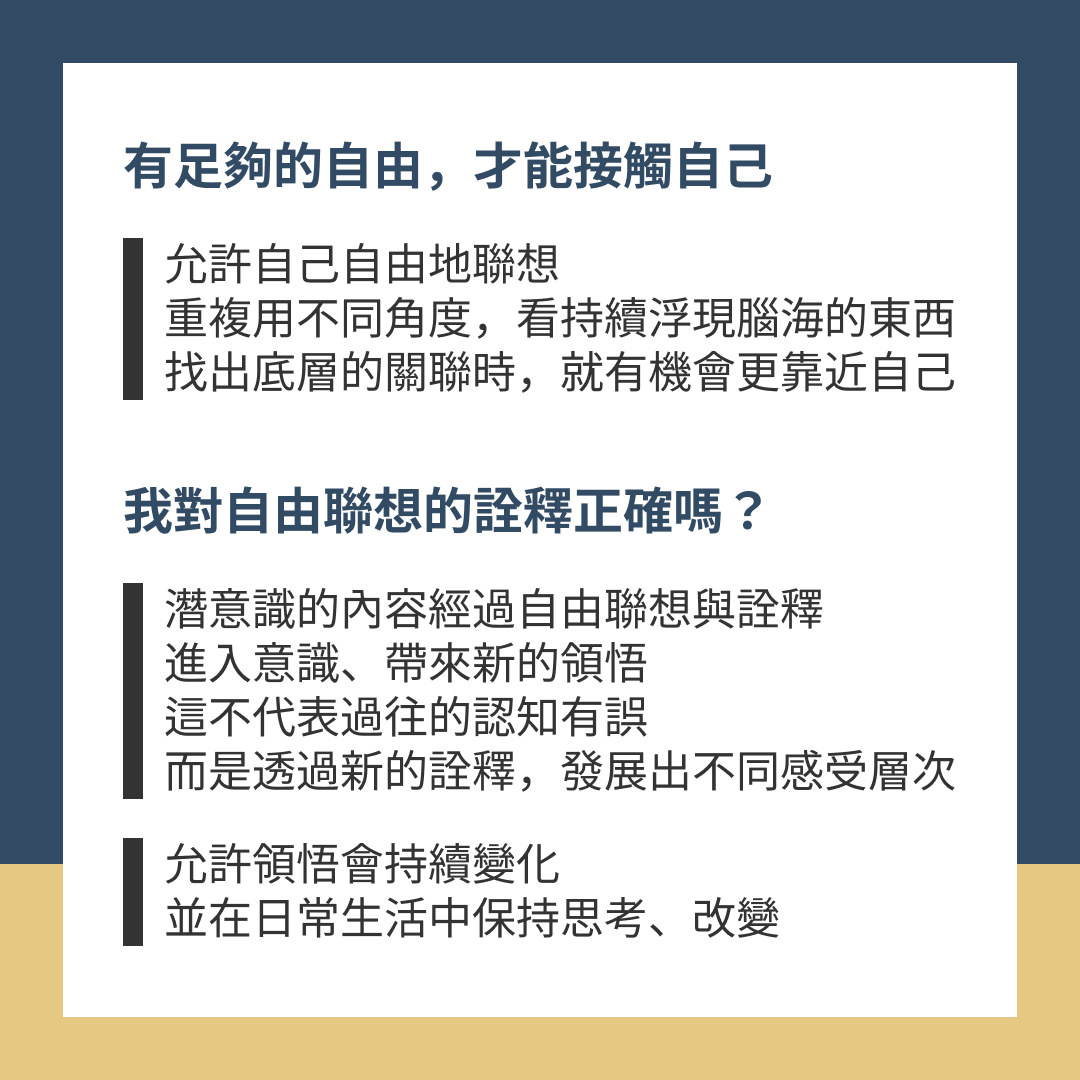 潛意識的內容,經過自由聯想與詮釋進入意識、帶來新的領悟,不代表過往的認知有誤,而是透過新的詮釋,發展出不同的感受層次
