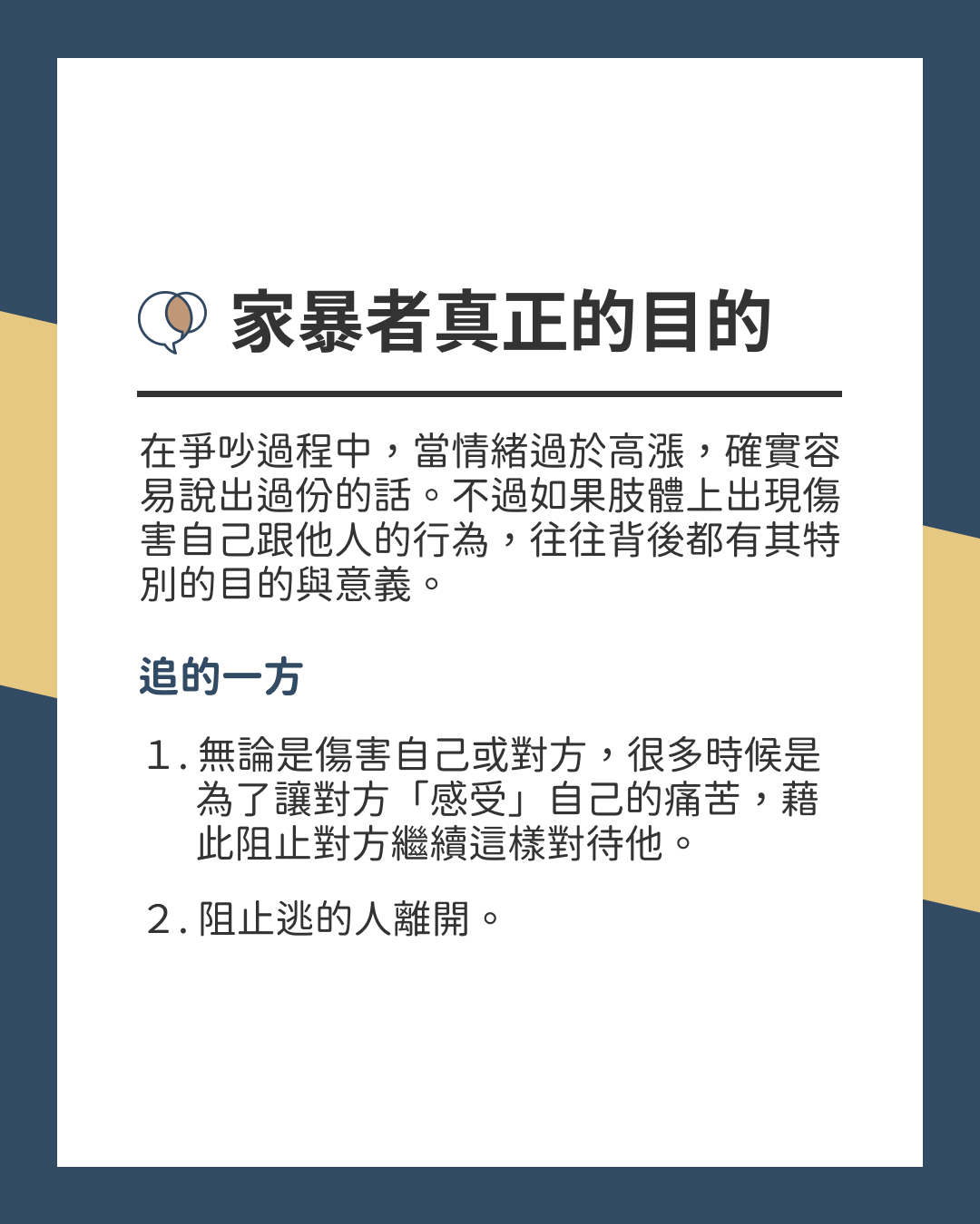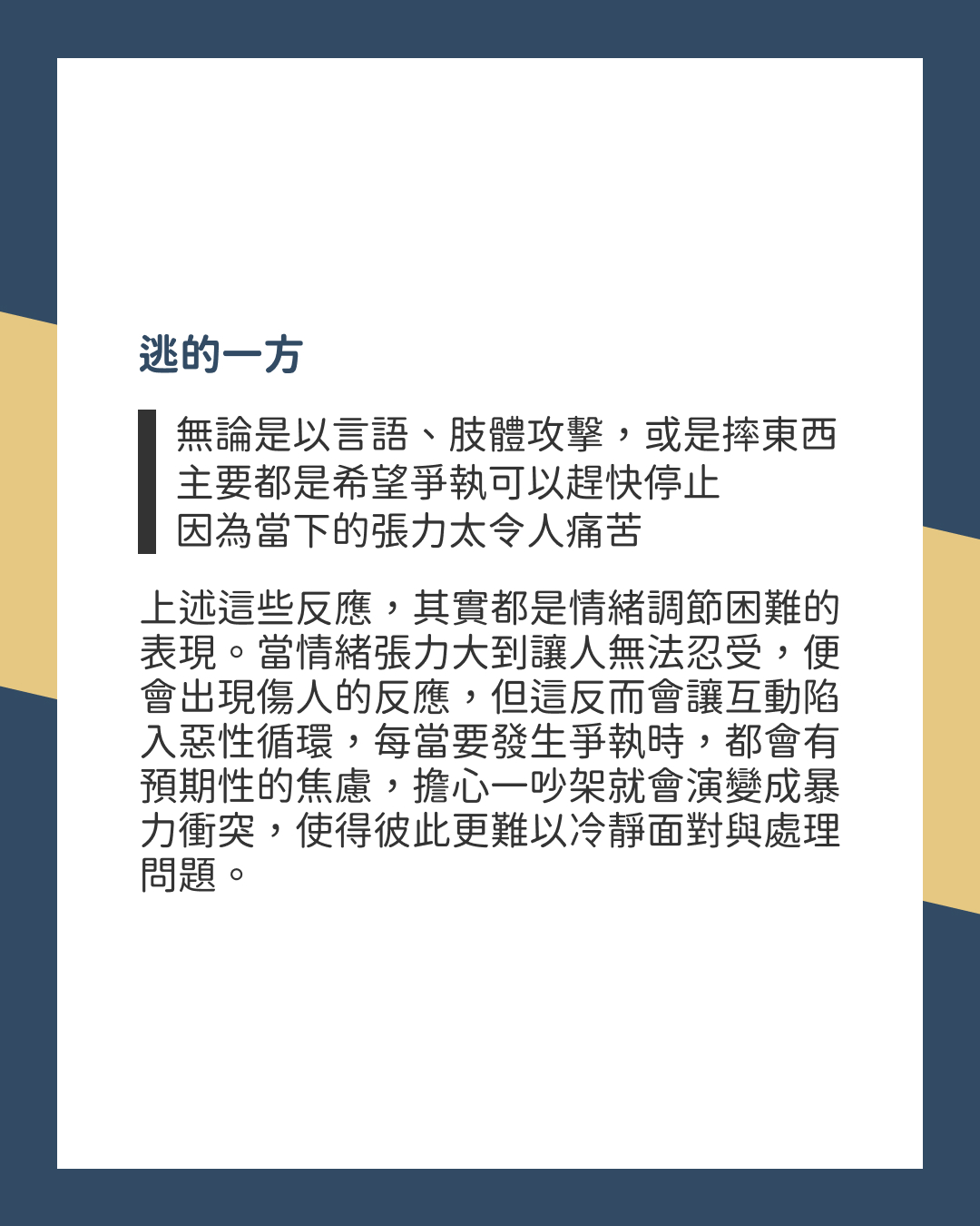 無論是以言語、肢體攻擊,或者是摔東西,主要都是希望爭執可以趕快停止,因為當下的張力太令人痛苦