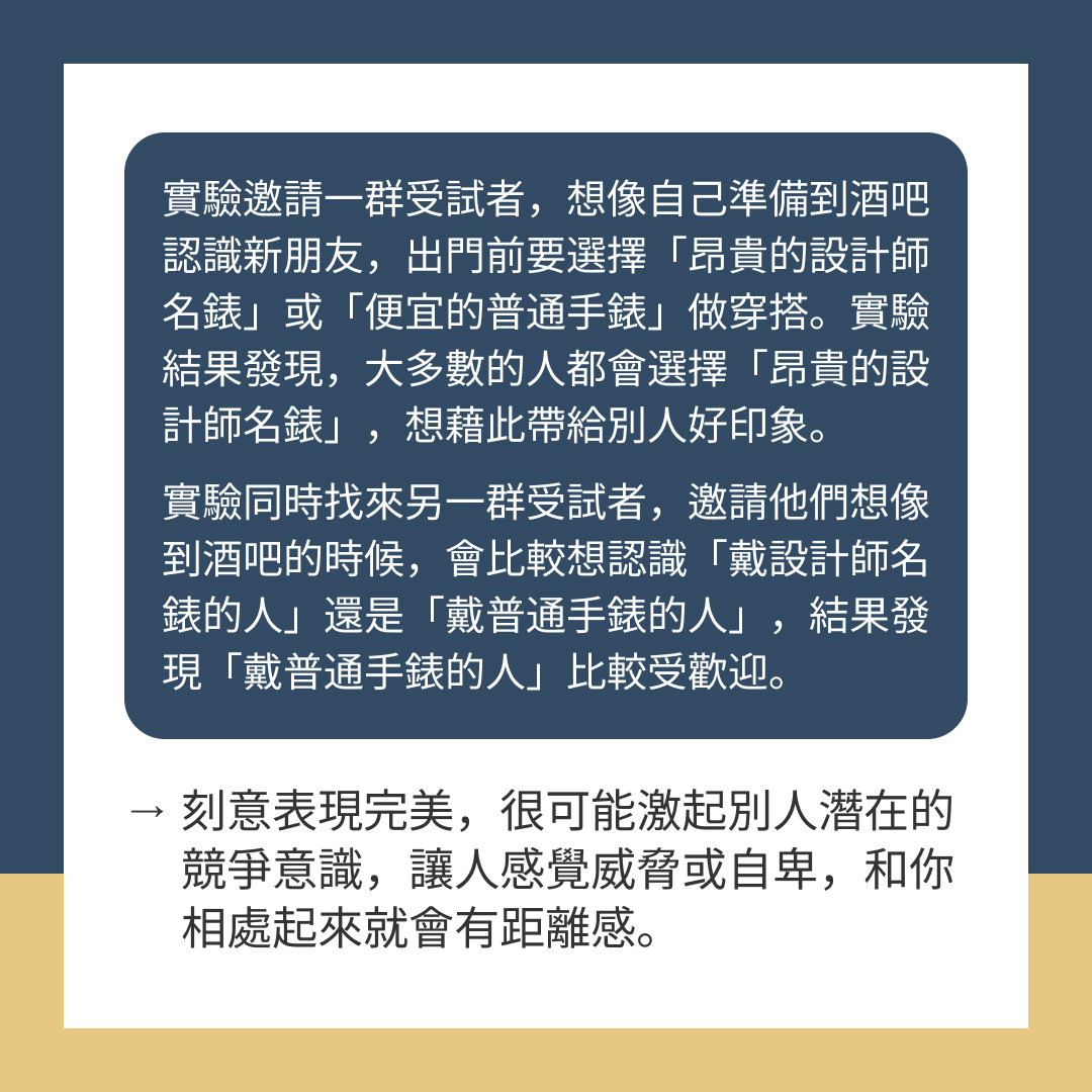 → 從心理動力的角度來說,如果刻意表現完美,很可能激起別人潛在的競爭意識,讓人感覺到威脅或自卑,和你相處起來就會有距離感。