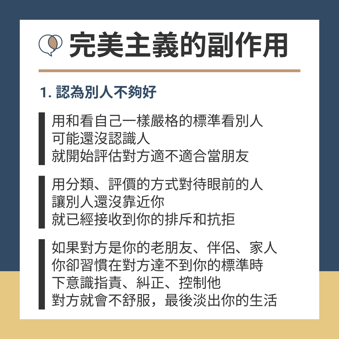 → 想要博取別人好感時,人會習慣遮掩自己的缺點,想讓自己看起來「完美」,但當你用高標準來要求自己,在人際互動上堅持「零瑕疵」、「零負評」,反而會讓自己跟身邊的人都很辛苦。