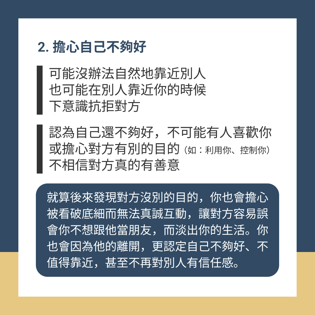 就算後來發現,對方真的沒有別的目的,你也會擔心對方看破你的底細,沒辦法跟對方真誠地互動,讓對方很容易誤會你,以為你不想跟他當朋友,而淡出你的生活,你也會因為他的離開,更認定自己不夠好、不值得靠近,甚至不再對別人有信任感