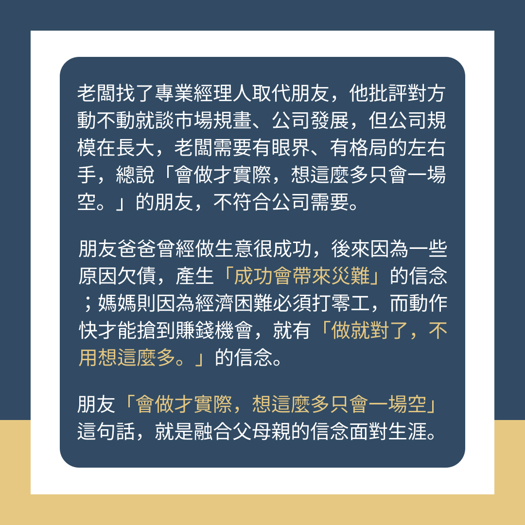 朋友的爸爸曾經做生意很成功,後來因為一些原因欠了債,產生「成功會帶來災難」的信念;媽媽則因為家裡經濟困難,必須打零工把他養大,而動作快才能搶到賺錢機會,也就有「做就對了,不用想這麼多。」的信念。朋友那句「會做才實際,想這麼多只會一場空。」融合了父母親的信念,並不自覺帶著這個信念面對生涯。